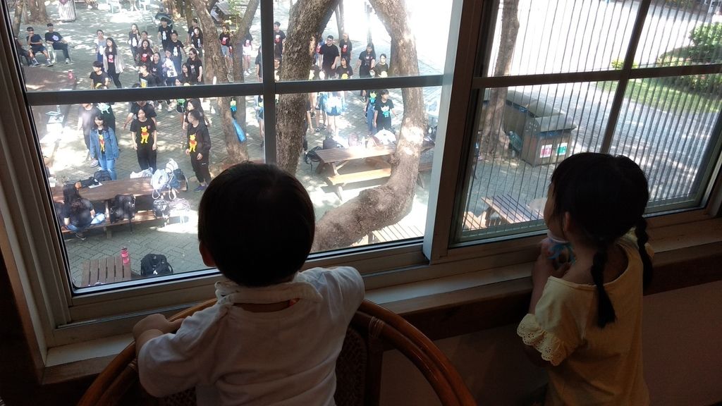 玩了一會兒,該回房間整理行李,準備退房了,今天有很多台藝大的學生在這辦活動,應該是康輔社的吧,彥也在那跟著跳的很開心...![]()