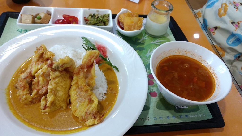 牧場咖哩優格嫩雞枊,酥炸後的雞枊,外酥內嫩搭配微辣咖哩醬,很好吃,只是咖哩醬太搶戲,完全蓋過雞枊醃漬優格醬的味道,附的蕃茄湯料多超濃郁,甜點奶酪也好吃,推推...![]()