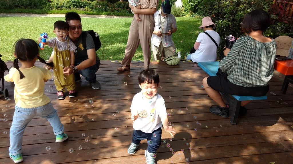 吃飽後在等媽媽上廁所的空檔,兩個小孩玩泡泡玩瘋了