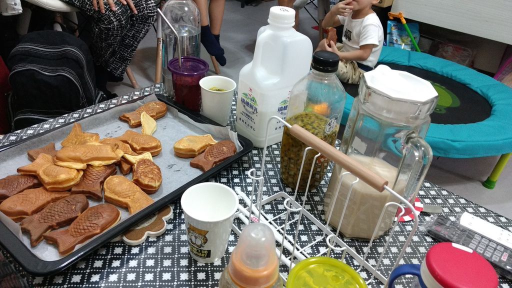 離開飛牛牧場後,往竹北到貢丸&琉琉家前進,路上慢慢開讓小孩睡個午覺充個電,一進來馬上就是整盤自製的鯛魚燒點心,外加整壺鮮奶茶、百香果汁、氣泡水、鮮奶上桌,彷彿要擺攤做生意的陣杖,照片還是後來想到補拍的,一開始更驚人,才剛吃飽不久馬上繼續餵食,我終於理解了在飛牛牧場時,下午那群小鴨子愛吃不吃的感受,既然都視乳糖不耐如浮雲了,卡路里也只是我食慾的墊腳石,衝吧!我的肚子...![]()