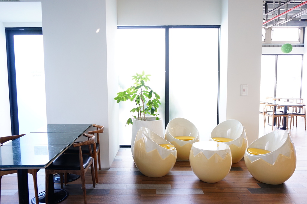 走了一天累爆,一夜好眠後,上頂樓吃早餐,蛋殼椅好可愛...![]()
