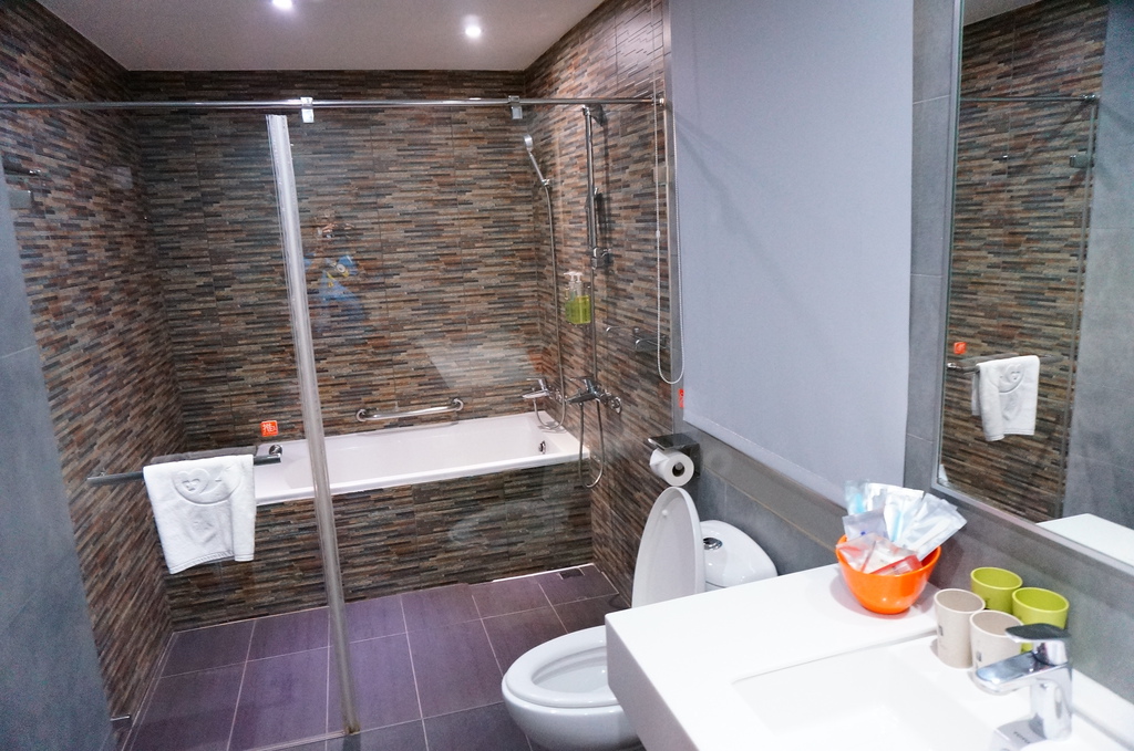 浴室也是超大空間,乾溼分離是標配已不稀奇,竟然還有個大浴缸,想淋浴或泡澡都可以,不過今年用水吃緊,響應省水淋浴就好,還是乾脆不洗換衣服就好省到極致...![]()