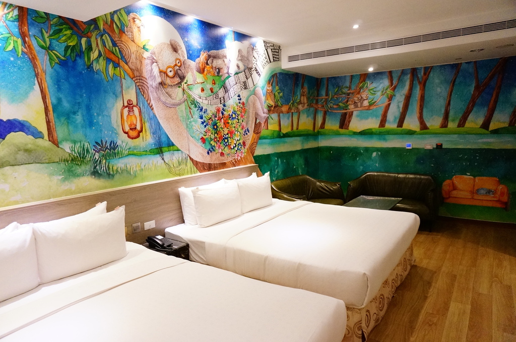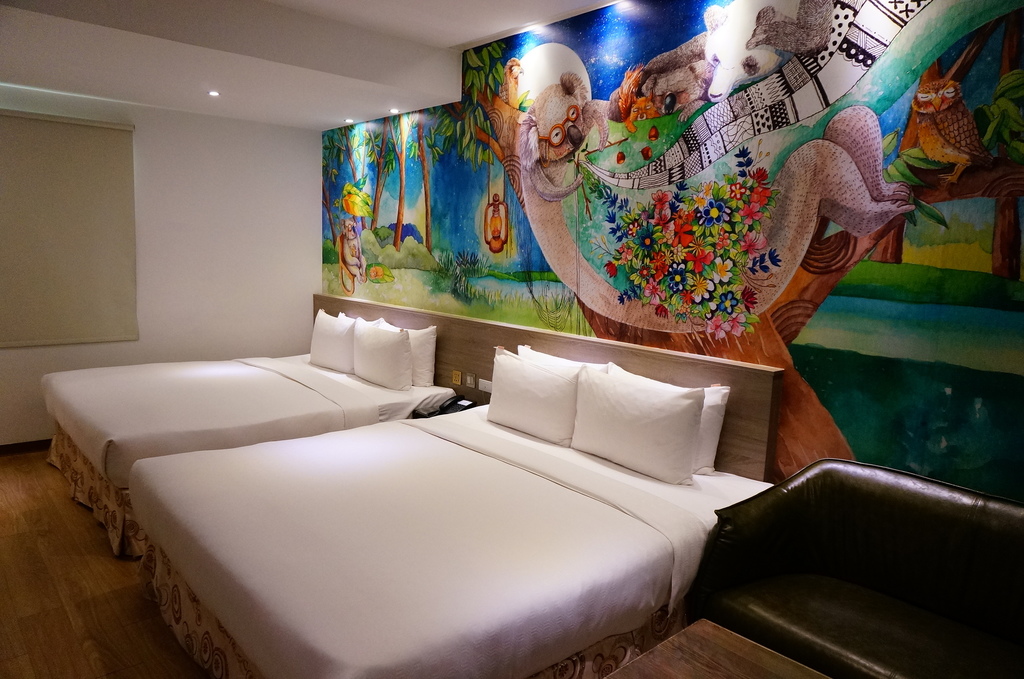 創意四人房,一晚不到二千五還含早餐的親子住宿,就可入住高雄觀光鬧區相當超值,超棒的兩張雙人加大床型,牆上插畫讓房間活潑生動了起來,住房空間十坪半相當寬敞,彥開心的來回奔跑起來...![]()