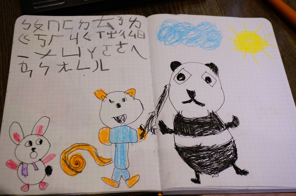 耶誕文具組則是在帶來的筆記本中,隨手畫起塗鴨來,不得不說挺有畫畫天份,但注音符號表漏寫這麼多,年尾囡仔大班念了第二年都白學了...![]()