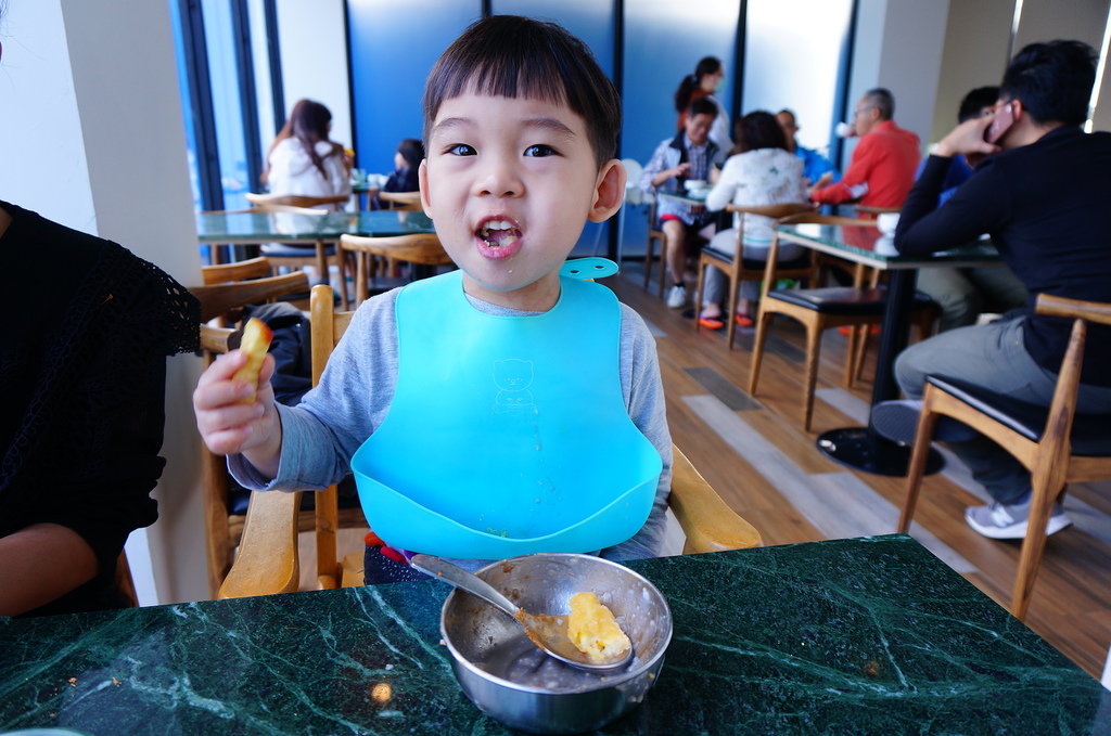 岑吃著喜歡的水煮蛋與麵包,當然還有薯條,吃的很開心...![]()