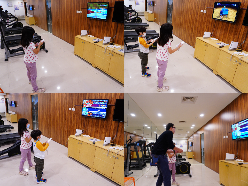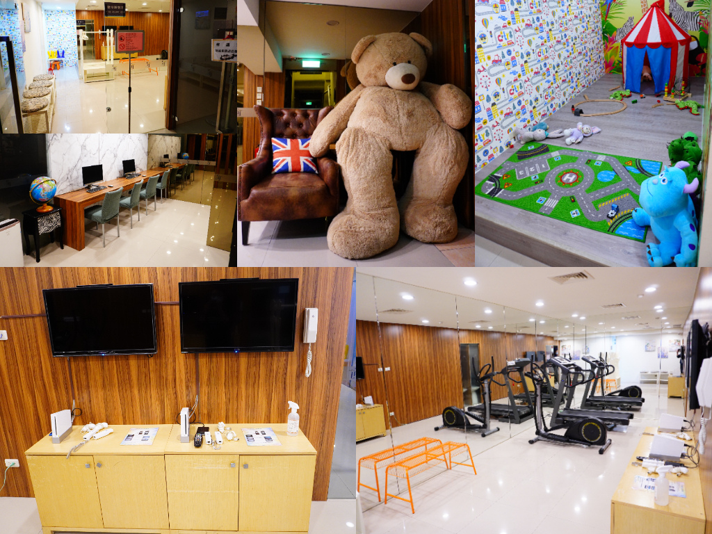 B1健身娛樂室,進來就是超大熊熊先吸睛,有親子遊戲室、電腦作業區、小健身房跟有點過時的WII,不過對屁孩來說就是新奇有趣高科技...![]()