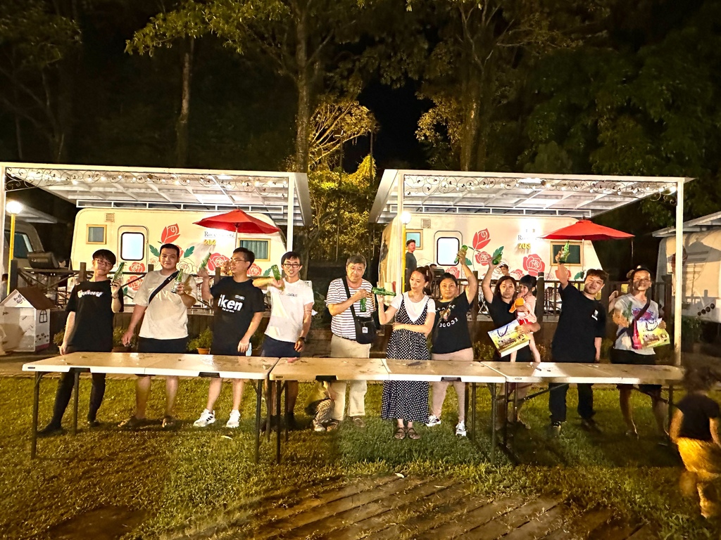 晚會到一半展開喝啤酒大賽,自由報名參加,要用粗吸管喝完舉在頭上算完成,前兩名有賞,喝到一半吸管還卡在瓶口吸不到,只好舉著繼續喝感覺像是偷吃步,索性慢慢喝好了,反正就是上去蹭一瓶免費海尼根,毫無意外拿了最後一名...![]()