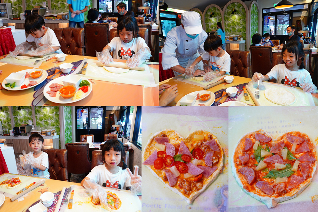 之前曾經玩過,熟門熟路灑麵粉桿麵皮,再用叉子將餅皮戳凹,下料時較好附著,再依喜好捏外型,呼叫大廚來幫忙,兩個愛心披薩就輕鬆完成,之後烤好還會幫忙送到二館很貼心...![]()