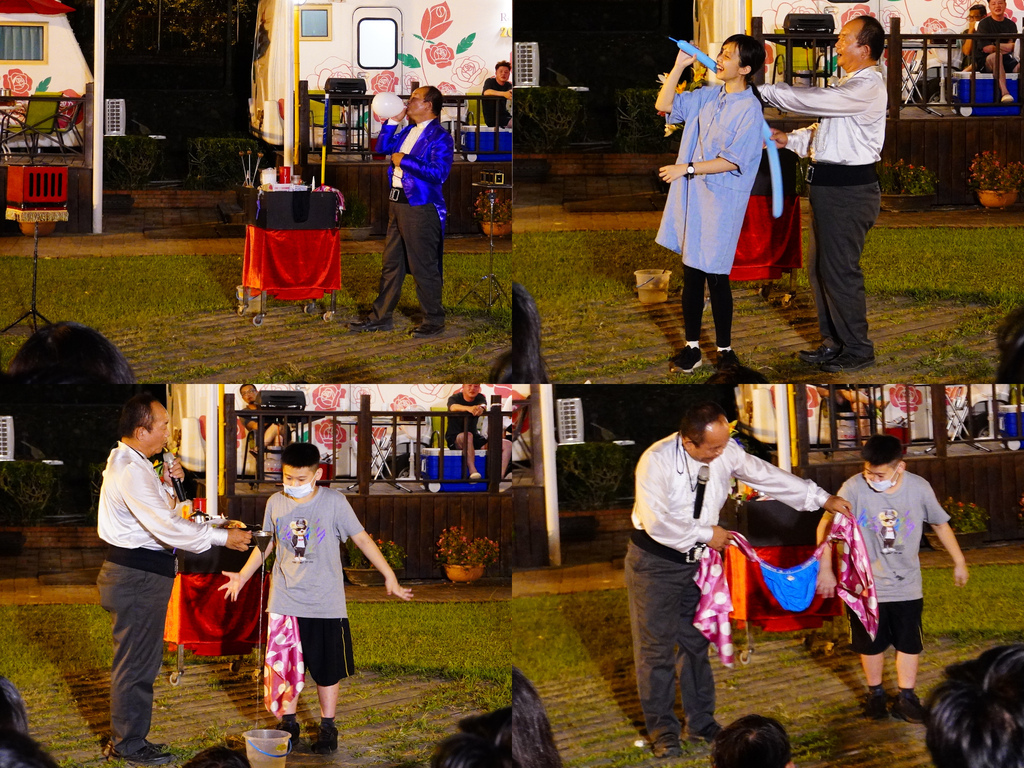 詩情夢幻城堡活動告一段落,轉往附近詩情花園渡假村續攤,下午有個手工披薩DIY有吃有玩,還有推桿王趣味遊戲,晚會活動豐富且熱鬧非凡,開場煙火先精彩一波,吉祥物跳舞合影,魔術表演天燈秀毫無冷場,玩仙女棒吃爆米花有夠愜意,已經在商量下次想住露營車啦...![]()