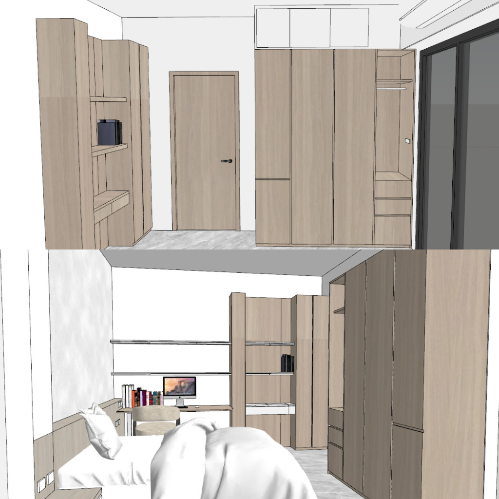 彥房間,房間雖比岑姊小些,但還能再規劃一組大置物櫃,除了大衣櫃空間翻倍,置頂增加收納,也避免冷氣風口會吹灰,床頭與書桌上方層板拿掉省預算...![]()