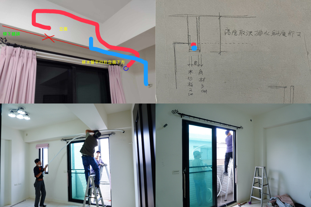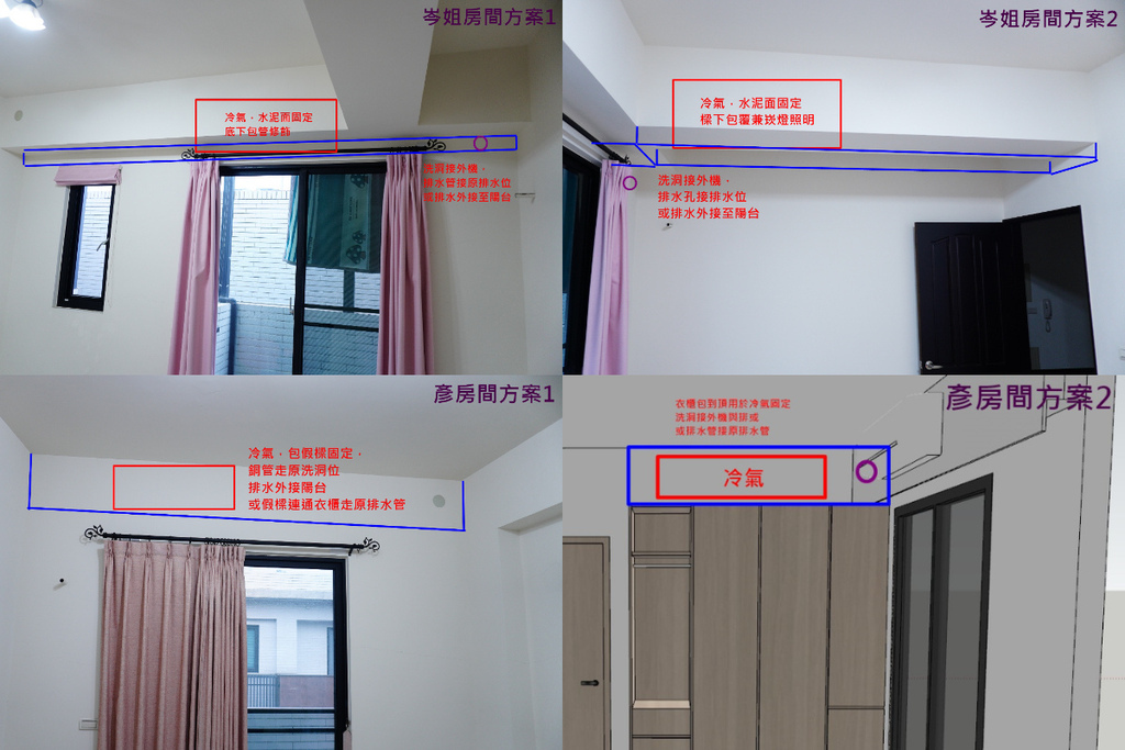 裝潢木工進場前,冷氣拉線的細節先考量好,再行美觀包樑,當初也是斟酌許久,各擬了兩方案跟設計師討論後,岑與彥房間都採方案1,岑姊房必須銑洞,彥房間照預留排水孔與冷媒孔...![]()