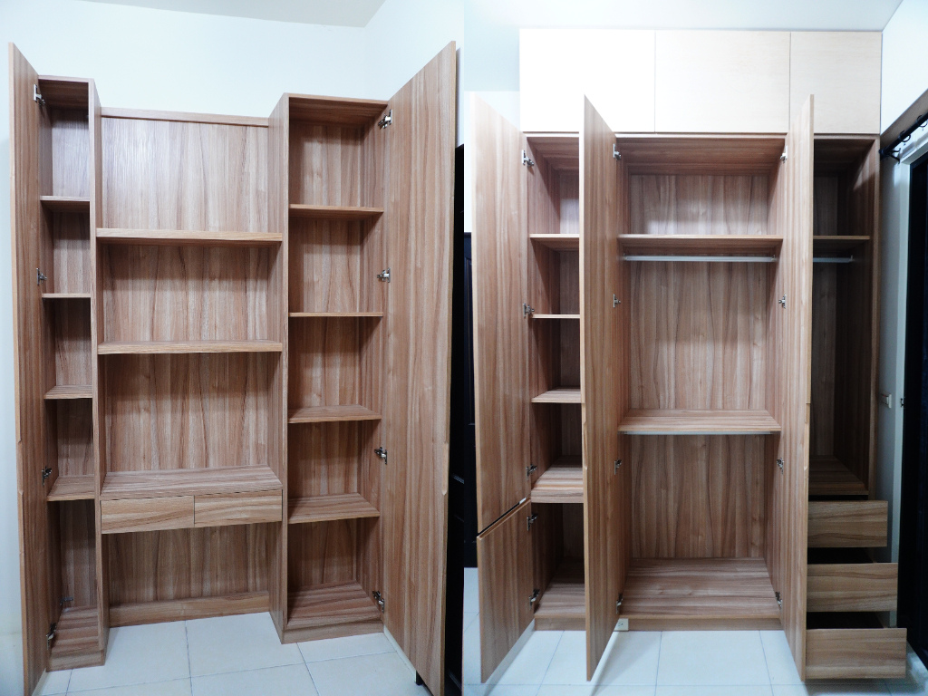 木作裝潢採木芯板貼皮,承重強度是系統櫃無法比擬,缺點是無法拆遷二次使用,規劃方向自然是人走櫃還在