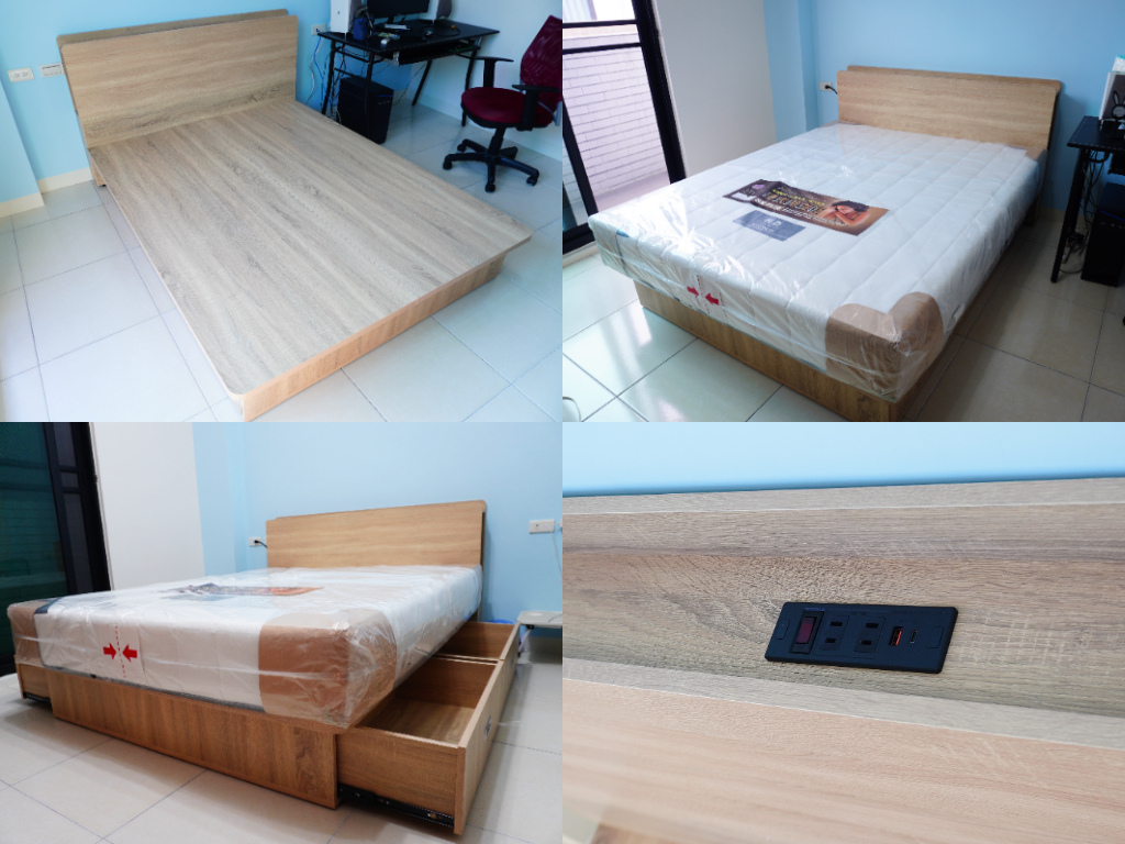 最後選了這組5尺被櫥雙人床組,床下三抽屜,床頭還有收納功能,還有插座可用,至於岑姊的床墊,多年前早已買好搬上來即可...![]()