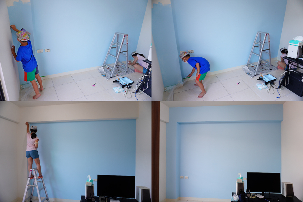 再來就是油漆,有認識好配合的廠商,價格也實在,施工前老婆小孩主動提案想要一面牆玩跳色,還去特力屋調漆...![]()