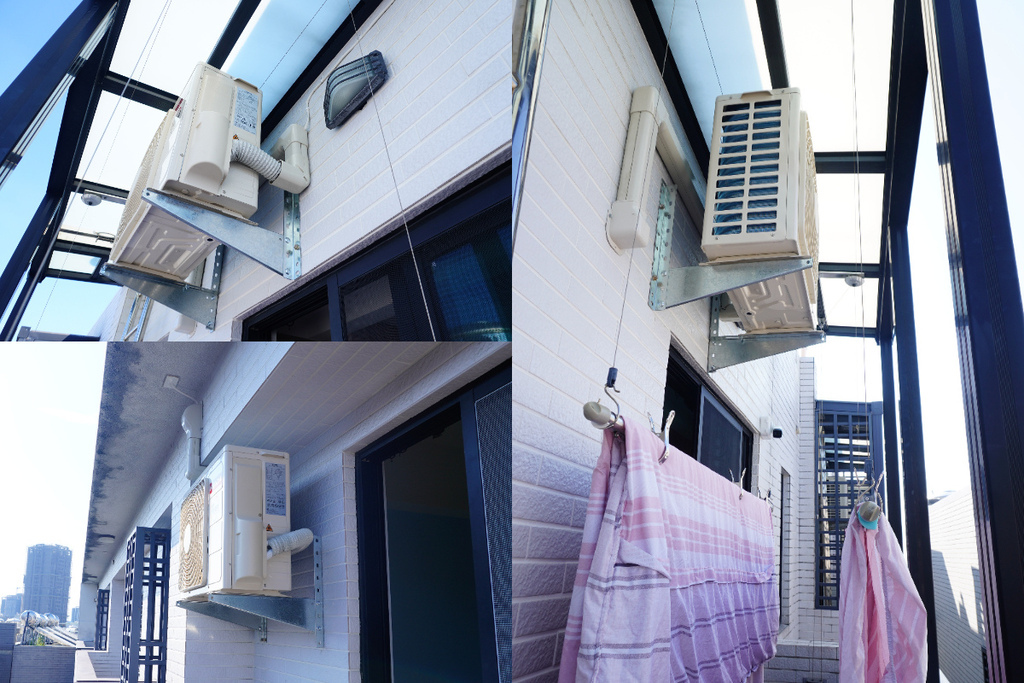 室外機巧妙的避開曬被手搖曬衣桿,加了管罩才有美感...![]()